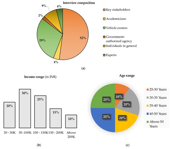 This study aims to determine the potential general drivers and barriers to implementing CE in the ELV recycling system in India. This study delves into the five fastest-growing automotive sectors in India’s major cities, namely, Kolkata, Chennai, Delhi, Mumbai, and Jamshedpur, to identify the barriers and drivers to India adopting the circular economy in the ELV recycling system in the broader sense. This study has adopted a mixed method that entails quantitative and qualitative research to meet the objectives of this study. For the purposes of determining the sample of individuals concerned, this study uses a stratified and systematic sampling technique. For this investigation, we interviewed a total of 560 selected respondents, incorporating key stakeholders, government agencies, experts, academicians, vehicle owners, and general individuals. The authors developed a well-structured questionnaire that has been reviewed and approved by eminent professionals in the CE and sustainability fields (see Appendix A, Appendix B and Appendix C for more details), then sent this questionnaire to the chosen respondents to glean data and relevant information regarding the present research aims. The data were collected and stored in a well-organized way for ease of analysis. For the data analysis, descriptive statistics that employed the weighted-average method, together with inferential statistics, were performed to investigate and develop a profound understanding of the drivers and barriers to implementing CE in the ELV recycling system in India. A thematic analysis has also been carried out to interpret the interviews and group discussions. Figure 1 provides specific demographic information for the survey sample, while Table 2 illustrates the approach used to gather information and data.