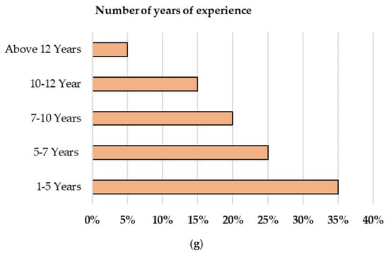 Demographic data for the survey sample: (a) interview composition; (b) income range; (c) age range; (d) gender; (e) educational level; (f) occupation; (g) stakeholders’ number of years of experience in ELV recycling.