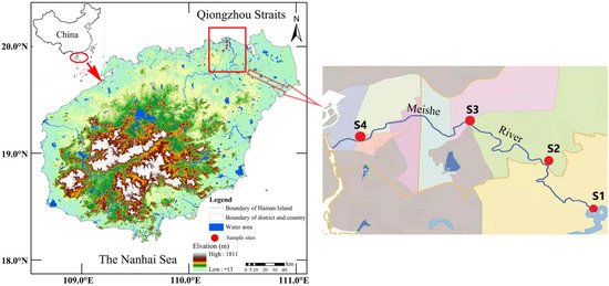 Previous studies have reported that microplastics found in the oceans mainly come from the rivers polluted with microplastics [11]. It had been estimated that, every year approximately 1.15–2.41 million tons of plastics are added into the oceans by the rivers [12]. In recent years, urban rivers are being considered as important “sinks” for urban microplastics emissions, with higher concentrations than those in the open ocean [13,14]. Luo et al. reported that, in Shanghai, microplastics are found in abundance in the urban river (i.e., 1.8–2.4 items/L) higher than that in estuarine and nearshore waters (0.9 items/L) [15]. Sediments from the urban freshwater rivers may serve as a reservoir of land-based microplastics as well as a source of marine microplastics [10]. So far, limited studies on microplastics in freshwater systems have been conducted, and the data on microplastics in freshwater ecosystems are mostly based on analysis of large lakes and rivers, except for the Taihu Lake [16], Qinghai Lake [17], and the Yangtze River [11]. However, microplastics pollution in inland rivers is unclear. The Meishe River is the longest urban river in Haikou and it passes through three districts of the city; its total length is 23.86 km, and the area of the watershed is 501,600 square meters. The water flows into the Haidian Stream and finally enters the Qiongzhou Straits. At present, research pertaining to the Meisha River is mainly focused on ecological investigation and restoration, but findings on the microplastics as emerging pollutants are still limited, hence there is lack of comprehensive understanding of the ecological balance in the river.