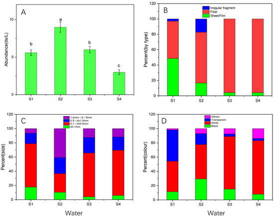 The spatial distribution of microplastics in surface water of all the four sampling sites, denoted by S1, S2, S3, and S4, is depicted in Figure 2A, which show significant differences in the amount of microplastics at the sampling sites. The abundance of microplastics in surface water ranged from 3 to 10 items/L. The microplastics found in the surface water obtained from S2 (Meishe River Wetland Park) were the most abundant, and the least amount was found in S4 (Changdi Road).