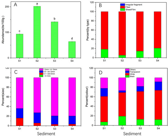The sediment samples were collected from the surface water of the corresponding sampling sites. Although there were differences among the sampling sites, the abundance of microplastics (61 to 198 items/100 g dry weight) in sediments was markedly higher than that found in the surface water irrespective of the sampling sites, with a maximum amount detected at S2, located in the Meishe River Wetland Park (Figure 3A).