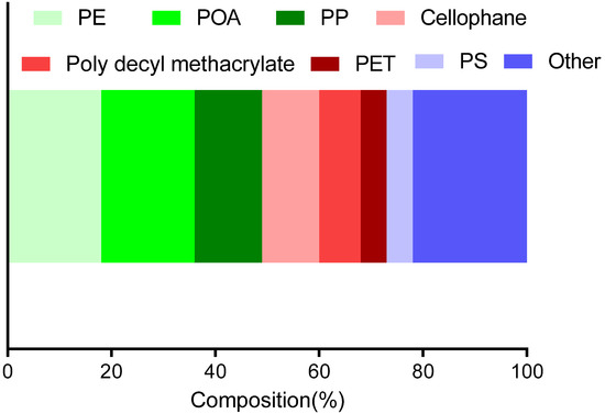 One hundred and five representative microplastic samples were randomly selected and their composition was determined using μ-FTIR. Among them, 46 samples consisted of 11 different types of microplastics (Figure 4, Table 2). For all samples as seen in Figure 5, polyethylene (PE) and poly octadecyl acrylate (POA) were the most common polymer types that were found (constituting 18.42% each), followed by polypropylene (PP, 13.16%), cellophane (10.53%), and poly decyl methacrylate (7.89%). The others were polyethylene terephthalate (PET, 5.26%), polystyrene (PS, 5.26%), and others accounting for 21.06%.