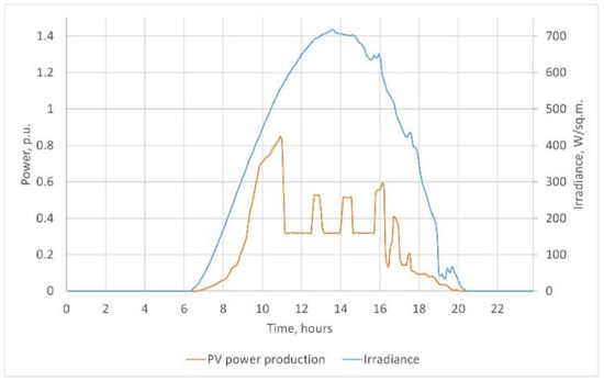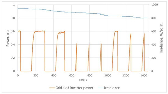 The experimental off-grid system described in Section 3 is unique, although the working principle and issues are the same for all off-grid or island systems; the supply and demand power balance issue is relevant for all grids. The RES in an off-grid system should be designed and connected via off-grid type inverters; in this way, when the consumption is low and the RES generates power, off-grid type inverters control their producing power according to the off-grid system power demand. Such a design is not efficient (because the excess power is spilled), but it works in balanced harmony with the other system components. As an example, in Figure 1, the off-grid system with RES connected to the system via off-grid type inverter operation is shown. Figure 1 visualizes a case when excess power is detected, at the detection of excess power off-grid type inverter limits its power production, even when irradiance (as well as the possible to produce power) is not changed.
