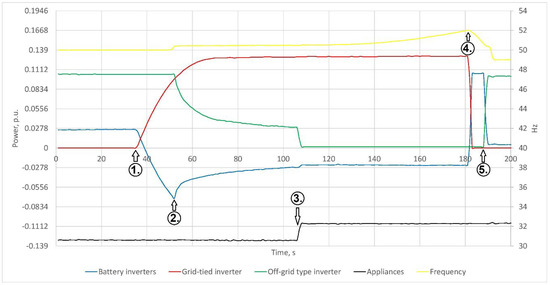 - A few seconds later, the off-grid type inverter (green line) reduces its power because the frequency (yellow line) reaches its operating set limit of 50.75 Hz;