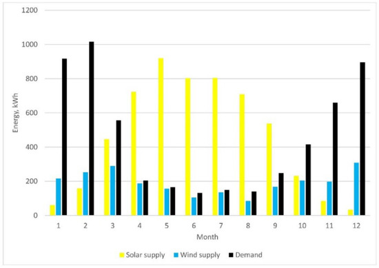 The sunniest period of time in Lithuania’s region is from the beginning of June through the end of August; in addition, due to holidays, the consumption of the laboratory is at its minimum during this time. On the other hand, during the winter, the consumption is at its maximum because of the need for electrical heating. Due to the highest RES supply during summer coincides with the lowest demand, the experimental off-grid system faces excess power in the summer and a shortage of electricity in winter. Figure 5 is used to visualize the demand of solar and wind power potential distribution throughout the year.