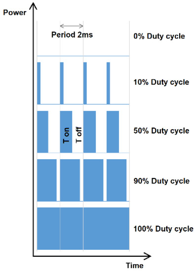 The Atmega 328P programmable board is used to create a PWM and make a VAPL device. The Atmega 328P digital pins produce either 5 V (when HIGH is selected) or 0 V (when LOW is selected), and the output is a square wave signal. Therefore, the voltage is never between 0 and 5 V, but the 5 V time might change according to the need. The example duty cycles of the PWM signal are illustrated in Figure 6.