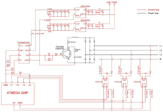 The experimental off-grid system has a 230/400 V three-phase system, and after the three-phase rectifier bridge, 620 VDC is achieved. The calculated Rmax of the VAPL device is 96.1 Ω and 6.45 A of current, and the total designed power of a device is 4.00 kW, which is enough to utilize the maximum possible excess power. The VAPL experimental prototype must be able to permanently switch 620 VDC and at least 6.5 A of current. Because of the voltages and currents, a VAPL device with an electric circuit scheme, as illustrated in Figure 9, is created. Energy dissipation is achieved through the created 97 Ω heater designed for maximum 5 kW electric power. In this scheme, there is a frequency-measuring loop, Atmega 328P programmable board, transistor driver, and power electronics loops.