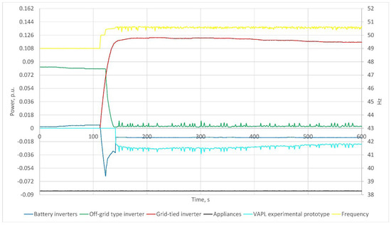 As shown in Figure 10, the off-grid system frequency is close to the set frequency of 50.75 Hz; the grid-tied inverter produces as much power as possible; the battery inverters charge the batteries in a float-charge mode; the off-grid capable inverter reduces its power to almost 0; and no more frequency rise or switching periods of the grid-tied inverter are observed. The VAPL experimental prototype has therefore been used to successfully demonstrate its dedicated task in such a system. The time lapse shown in Figure 10 is 600 s long to enlarge the time period when excess power is detected.