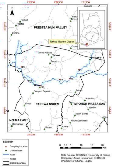 Geographical map of Tarkwa Nsuem and Bonsa River. Distance of sample locations: S1–S2 = 7.5 km; S2–S3 = 7.7 km; S3–S4 = 11.5 km; S4–S5 = 8.4 km; S5–S6 = 7.9 km.