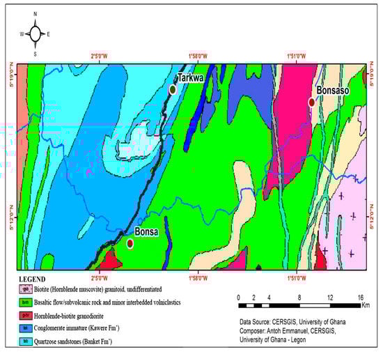 The Bonsa is 44 kilometres long from where it meets the Ankrobrah to where it emerges at its source. Residents in Bonsa, farther downstream, and at the water treatment facility’s source are likely to suffer negative effects from any hazardous substance that enters the river system. The Bonsa River feeds Ankobrah, which empties into the sea. The Bonsa river is made up of rocks from the Birimian and Tarkwain formations. People think that these types of rocks are what make the water in the area so mineral-rich. The ridges that are part of the gold mining concessions are where almost all of the water that flows into the Bonsa river comes from [,]. Figure 2 represent the geological map of Bonsa River and the Tarkwa-Nsuem Municipality, Western Region, Ghana.