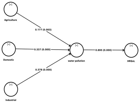 The significance of the relationships is then determined using the route coefficients. These outcomes are all shown collectively in Table 4. The significance of the link was acknowledged based on the p-value at five percent significance level (<0.05). The R2 values of the endogenous latent variables are examined in the third stage. According to our findings, the suggested model can, on average, account for water pollution and HRQoL at 72.1% and 80.1%, respectively [].