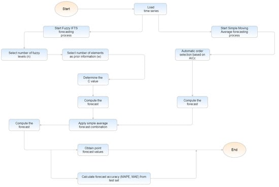 In this paper, the simple average combination of SMA (Simple Moving Average in State Space form) and IFTS (Improved Fuzzy Time Series), is proposed. The statistical software “R”, together with the packages “smooth” and “AnalyzeTS” were used to simplify this batch-forecasting process by implementing different customized forecasting scripts. Figure 1 shows the forecasting flowchart.