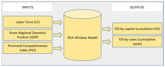DEA is a nonparametric assessment and production theory-based mathematical method for benchmarking similar element types based on predetermined inputs and outputs [54]. A decision-making unit (DMU) to be compared can be peers such as schools, manufacturing companies, hospitals, countries, states, and cities, to name a few. The motivation behind DEA is to use linear programming-based optimization to measure efficiency from either an output maximization, or input minimization, perspective [55]. DEA has been widely used to evaluate the performance of diverse entities in various areas: energy efficiency [56], city performance [57,58], system efficiency [59,60], and environmental performance [61]. Regarding FDI efficiency assessment, DEA has been effective in defining the efficiency score of a host economy in attracting FDI, which has successfully been utilized in the various following studies. Lei et al. (2013) [16] used DEA to analyze the FDI attractiveness for the sustainable development of 30 provinces in China. Mastromarco and Simar (2015) [62] introduced the time-dependent conditional DEA estimators to study the effect of FDI and time on catching up in 44 countries during 1970–2007. Dai (2016) [63] conducted a study on FDI efficiency between Korea’s and China’s major cities using the group method of data handling (GMDH) and DEA methods. Teplova and Sokolova (2019) [64] employed the DEA method and DEA–Malmquist to measure the efficiency of FDI transformation on a sample of 31 developed and developing countries. Zhang et al. (2019) [65] used the DEA scale return model to calculate the efficiency of environmental protection spending in China and test the linkages among FDI, fiscal decentralization, and government expenditure efficiency. Pan et al. (2020) [66] studied the impact of FDI quality on energy efficiency using the slacks-based measure data envelopment analysis (SBM-DEA) method. Wang et al. (2022) [67] presented a dynamic direction distance function–data envelopment analysis (DDF-DEA) model to investigate the efficiency of attracting FDI with the inclusion of environmental regulation in 31 Chinese provinces over the period 2015–2017.