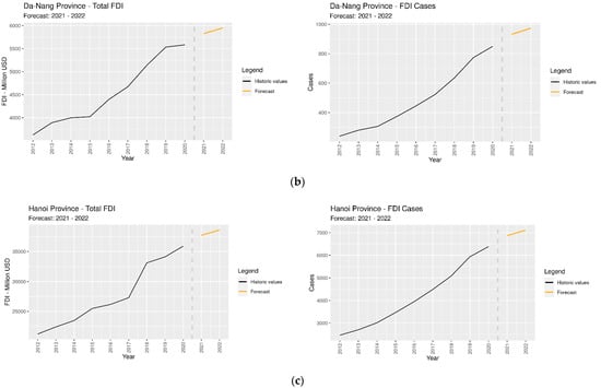 In this paper, a two-stage methodology is proposed to evaluate FDI attractiveness in Vietnam’s provinces, to understand their past, current, and future performance, and benchmark them against the efficiency frontier. Initially, a set of indicators was selected through a literature review and experts’ opinions, which were considered to be key performance factors contributing to measurable values that demonstrate how effectively a host economy is achieving their efficiency of FDI attractiveness; these indicators are necessary data for policymakers to develop strategic plans for attracting and developing the FDI sector in association with Vietnam’s sustainable development strategy. The future patterns of FDI, as well as other indexes such as GDP, are important inputs for policymakers, even more so during severe economic downturns, such as the one caused by the COVID-19 pandemic. Thus, in the first stage of the suggested model, two forecasting methods, simple average combination of SMA (Simple Moving Average in State Space form) and IFTS (Improved Fuzzy Time Series), are applied to predict future values (2021–2022) based on collected historical data (2012–2020). In the second stage, data envelopment analysis (DEA) is employed to evaluate the efficiency of the provinces in terms of their FDI attractiveness during the period 2012–2022. In this direction, to deal with problems of unfair measurement during the 11 year analysis (2012–2022), we use an extended DEA approach, specifically, DEA window analysis is used to detect performance trends over years. While traditional DEA has been used in previous empirical studies which have mainly focused on static efficiency evaluation, which lacks evaluation and analysis in different time periods, DEA window analysis was followed in the development of dynamic DEA by Malmquist (1953) [15] in estimating catch-up and innovation effect. Thus, DEA window analysis is utilized to assess and quantify efficiency change on a yearly basis. To our best knowledge, the integrated approach proposed in this research has never been reported in the existing literature, especially for evaluating FDI attractiveness in the Vietnam context.