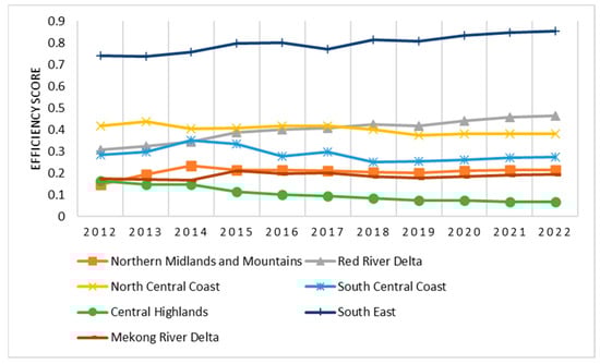 We examined the FDI attractiveness of 42 out of 63 provinces in Vietnam using data from 2012 to 2020 and projected values for 2021–2022. The twenty-one missing provinces were largely in the highland regions, where foreign investors are not the main focus of the economy. According to Figure 2 and Table 1, the researched provinces were divided into the seven major economic areas of the nation.