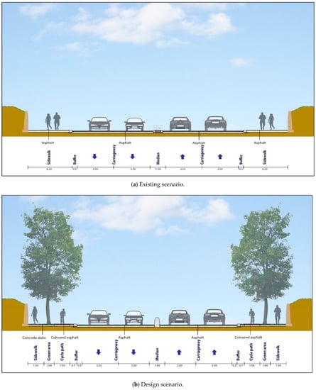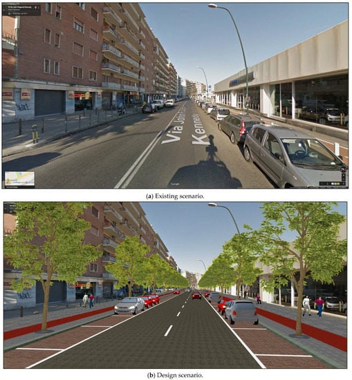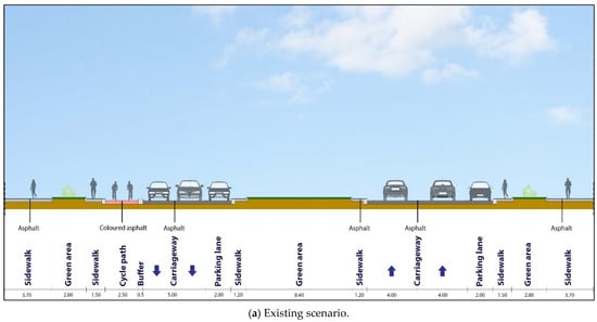 The sustainable complete streets design criteria can be employed in the retrofits of urban areas and help to enhance overall community sustainability. The design scenarios proposed in this study were conceived to help practitioners to consider these context-based uses and design accordingly, gaining knowledge from past experiences to benefit future projects; however, not every street is intended or is suitable for the accommodation of every user mode. The complete streets design criteria have large sets of potential competing priorities, where the importance of each priority will vary depending on the street context and its role in the network []. Hence, the identification of the different priorities by street type is necessary to begin to understand the trade-offs among a street’s required function, its space organization, and traffic volume.