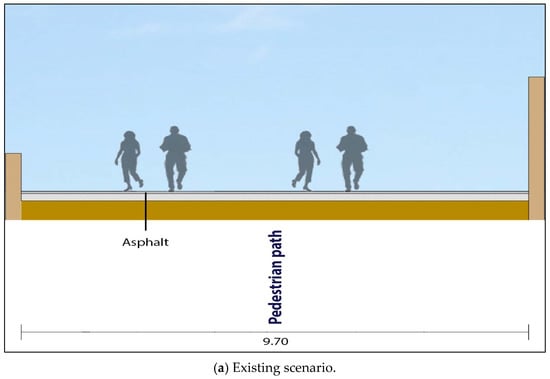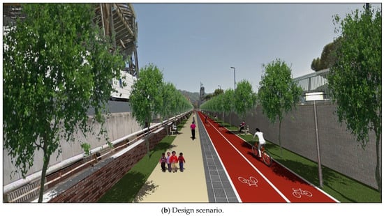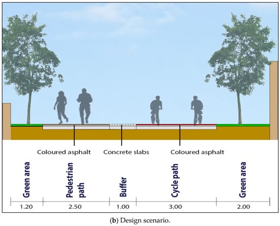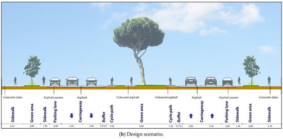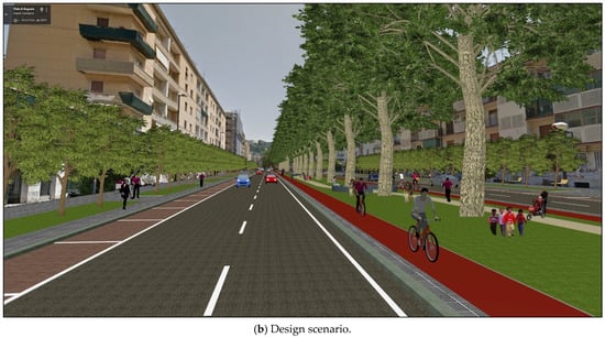 The design elements were built based on a homogeneous choice of materials, colours, lighting, and treatment of green spaces, and have a potential significant impact on the liveability of the area and its aesthetics. Indeed, previous studies have demonstrated how an improvement in the quality and ambience of city life is strongly associated with its landscaping [,]. Furthermore, different users’ needs are considered to ensure that mobility is equally safe and comfortable for all users. The presence of parts of the streets dedicated to pedestrians and cyclists improves their access and visibility, discouraging high vehicle speeds and promoting human-scale activities.