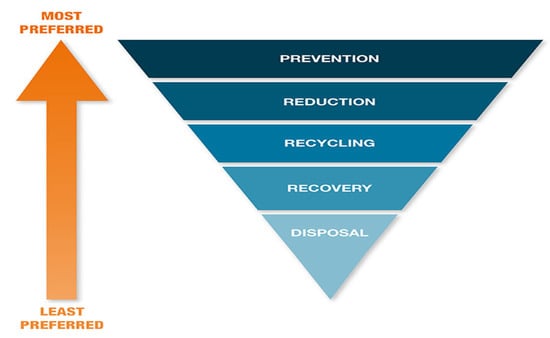 Eaton is another company concerned about the environment; it has reduced its total landfill waste from 33,400 tons to 25,100 metric tons. More than 120 of its facilities send zero waste to landfills, and the company is seeking to increase this in the near term by another 20 sites. These more prominent companies have used waste-management companies’ services for better optimal usage of resources []. Figure 1 shows the intentions of the companies. The top priority of the companies is to prevent waste creation. Disposal is the lowest priority. Researchers have conducted a literature review and an analysis of companies in the context of sustainable energy waste management for Australia, Bangladesh, Brazil [,,], China [,], Egypt [], and from a global perspective [,,,,,,,,,,]; environmental practices of companies are shown in Figure 1.
