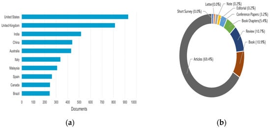 (a) Countries-wise studies by source; (b) studies in journals by document type.