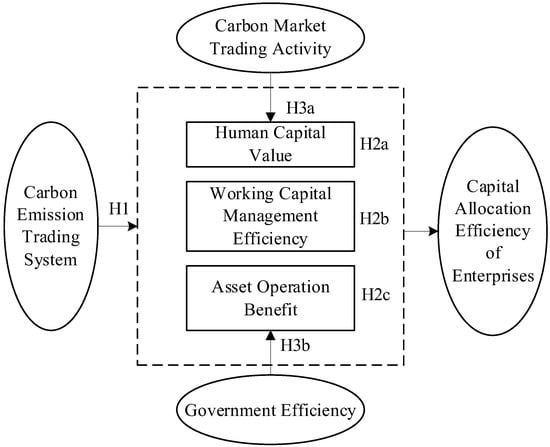 Another type of literature that is closely related to this study revolves around the definition and influencing factors of corporate capital allocation efficiency. The existing literature generally defines the efficiency of corporate capital allocation as the degree to which internal financial capital is allocated to projects with the highest marginal efficiency [19,20,21]. However, there are also a few scholars who include various production factors of enterprises into the category of capital, and believe that the efficiency of capital allocation can be measured by the output efficiency of production factors of enterprises [5,22]. Regarding the influencing factors of corporate capital allocation efficiency, existing research believes that R&D investment, labor force and policy environment will affect corporate capital allocation efficiency. Based on the perspective of R&D investment, Wu et al. [23] believed that increasing R&D investment promotes enterprises to cultivate market competitiveness while improving the level of technological innovation, so as to obtain more output from limited investment, which is ultimately reflected in the efficiency of capital allocation; from the perspective of labor force, Belo et al. [24] conducted an empirical study using the data of U.S. listed companies and found that corporate employment rate has a negative impact on capital allocation efficiency by reducing stock returns; based on the perspective of policy environment, Ma et al. [25] explored the relationship between industrial policy and the efficiency of corporate capital allocation, and found that industrial policy hindered the free flow of capital, thus reducing the efficiency of corporate capital allocation. From the review of the above literature, it can be seen that the carbon emission trading system will affect the basic activities of enterprises in the daily operation of enterprises, such as technological innovation, labor demand and business decision-making, while encouraging enterprises to reduce emissions. It can further reveal the impact of the carbon emission trading system on the capital allocation efficiency of enterprises through the above activities. In addition, when defining capital allocation efficiency, the existing literature generally equates capital allocation efficiency with fund allocation efficiency or investment efficiency. However, in addition to using financial capital, enterprises can also use human capital and asset capital to create value for themselves [26,27]. Therefore, this paper will integrate various types of capital of enterprises and analyze the impact of the carbon emission trading system on the efficiency of capital allocation.