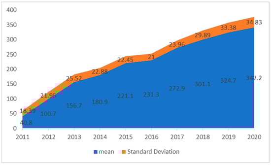 Before conducting the baseline regression, this study plots the trend of the mean and standard deviation of the total digital inclusive finance index from 2011 to 2020 (as shown in Figure 1) to more clearly demonstrate the development trend of digital inclusive finance in China. From the change trend of the mean value, China’s digital inclusive finance as a whole shows a continuous development from 2011 to 2020, with two rapid development phases from 2011 to 2013 and from 2016 to 2018. In terms of the trend of the change of standard deviation, the overall trend shows a rise, then a decline, and then a rise again. It indicates that with the improvement of the level of digital inclusive finance, the gap in the development level of digital inclusive finance among Chinese provinces gradually began to increase from 2011 to 2013, and this gap began to narrow by 2014, and widened again by 2017.