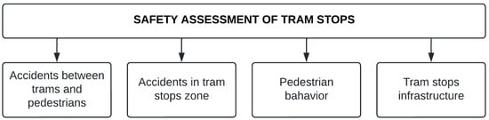 The conducted literature review shows that in the methodology of assessing tram and bus stops, the researchers focus primarily on aspects related to safety. Transport safety, including tram transport, is usually analyzed regarding threats and risks associated with implementing transport services. In the case of tram services, two types of safety risks should be analyzed, those related to the operation and maintenance. Szmagliński et al. [] state that there will be a different character of risk in using the tram system and others in its operation. It is assumed that during tram operation, passengers, tram personnel, and road users, including pedestrians, will be at risk, while during tram maintenance, maintenance staff will be at risk. Therefore, research on tram system safety covers an extensive range of analyses in both the operation and maintenance areas. One of the areas studied related to the safety of the tram system is the safety of tram stops. Our literature review shows that the safety assessment of tram stops focuses primarily on the four areas shown in Figure 2.
