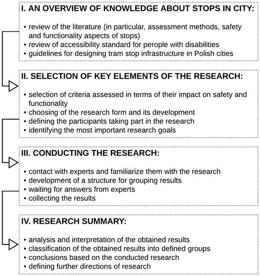 We invited experts who participate in managing the infrastructure of stops in cities with a tram communication system. The article aims to present the results obtained during the conducted structured interviews and their interpretation. The article’s structure is presented in Figure 1.