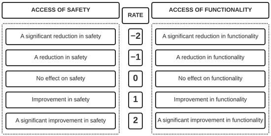 In the next stage of the analysis, the obtained results were divided according to the assessment of their impact on each of the two examined criteria. These factors were classified into three distinguished groups that defined a positive, neutral, or negative aspect of functionality and safety. Table 4 presents the classification of individual elements.