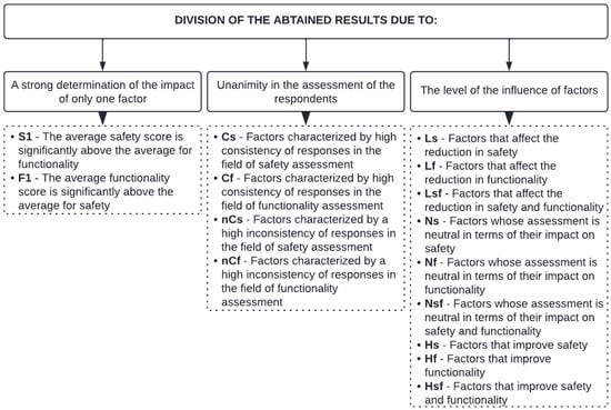 In parallel with the implementation of the survey developed, a scheme for classifying the obtained results into the identified groups was developed based on the obtained result. Figure 6 presents the distinguished categories in the proposed classification. The obtained results can be classified depending on the selected division criterion. The division characterizes the first evaluation criterion according to the predominant influence of a given factor on the aspect of safety (S1) or functionality (F1). The second division relates to the consistency of assessment among the respondents. Within this division, one can observe factors characterized by high consistency (Cs or Cf) or large discrepancy (nCs or nCf) of the obtained results. Within this division, the elements represented by the respondents’ highest and lowest consistency of responses were classified into each group. The last of the division criteria is grouping according to the obtained assessment result, and thus we can distinguish three types of impact on the assessed aspects: