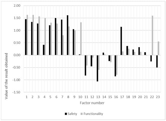 The results obtained during the research were grouped according to safety and functionality. The results obtained for each element are shown in Figure 8. The analysis concerned the assessment of the influence of the given factor on each criterion separately. In addition, the mutual relation between them was assessed. Thanks to this, it was possible to estimate the influence of the given factor on each criterion and indicate the advantage of the impact of only one criterion for the analyzed factor. At the same time, the analyzed elements were grouped in terms of unanimity in their classification by the respondents.