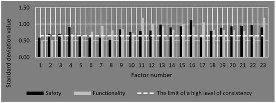 Figure 9 presents the values of standard deviations of individual factors broken down into safety and functionality ratings. The authors recognized the deviation value at the level of 0.65 due to classifying the responses to high consistency. This value classifies four factors in each assessment as characterized by the high consistency of the answers.