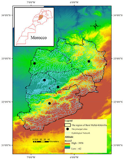 The region of Beni Mellal-Khénifra, presented in Figure 1, is geographically located between the latitudes 31°33 and 33°46 North and the longitudes 5°28 and 7°00 West. It covers an estimated area of 28,088 km2, divided into five provinces: Beni Mellal (4528 Km2), Fquih Ben Salah (2547 Km2), Azilal (10050 Km2), Khénifra (6713 Km2), and Khouribga (4250 Km2) [20]. Concerning the topography of the region, the study area ranges from an elevation of 900 m to 3890 m in the mountains, which represents half of the region, while the other half is made up of plains and plateaus of about 600 m [21]. The highest peak in the basin is 3890 m above sea level.