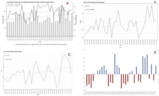Evolution of climate indicators of Beni Mellal-Khénifra region over the period 1982–2015. (a) Evolution of the cumulative rainfall and the average temperature; (b) Evolution of NDVI; (c) Evolution of VCI; (d) Evolution of SPI.