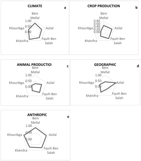 Regarding geographical vulnerability, the province of Azilal has a very high vulnerability with a score of 1. It is followed, respectively, by Khénifra, Khouribga, and Beni Mellal, whereas the province of Fquih Ben Salah is the least vulnerable (Figure 3d). As regards anthropic vulnerability, the province of Khouribga is the most vulnerable. The provinces of Beni Mellal, Azilal, and Fquih Ben Salah follow it, respectively. The least vulnerable province is Khénifra with a score of 0.73, which is in the high vulnerability category (Figure 3e).
