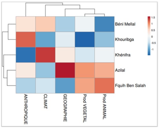 Table 3 shows the scores of the standardized indicators selected according to the five components proposed for the five provinces of the Beni Mellal-Khénifra region.