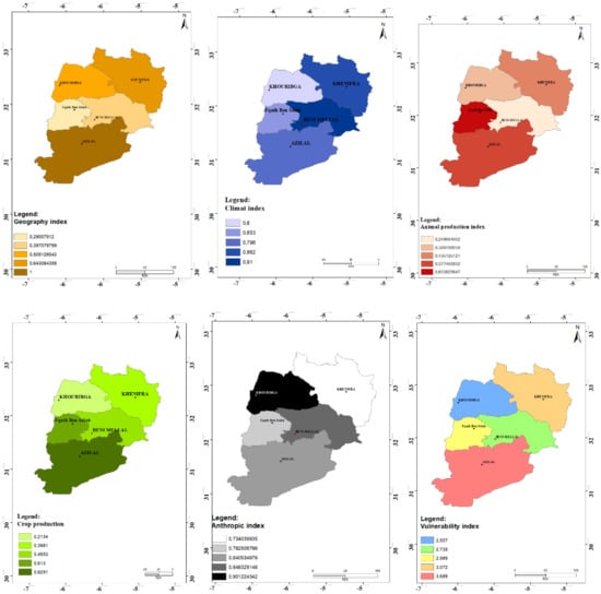 Various methods have been developed to assess vulnerability, including Turner’s model, the Risk-Hazard (RH) model, the Pressure and Release (PAR) model, the Driver-Pressure-State-Impact-Response (DPSIR) model, and Composite Index (CI) approaches [19]. This research article aims to create an index of the vulnerability of agriculture to climatic and anthropogenic hazards in one of the twelve regions of Morocco, which is the region of Beni Mellal-Khénifra. This index is based on several indicators grouped into five components, namely, climate, plant production, animal production, geography, and anthropogenic. The approach followed is based on the modeling of these indicators by applying statistical methods, GIS, and a survey of experts in the field. This work has been framed by the Sustainable Development Goals, in particular, Goal 2 titled “Zero Hunger”. The latter goal describes the food and agricultural sector as offering key development solutions, being central to eradicating hunger and poverty. Goal 13, which concerns itself with measures to combat climate change, has also been monitored as the fight against global warming, and has become an inseparable part of achieving sustainable development. This research work will be a further contribution to our study area. The results provided essential information enabling managers to plan and implement adaptation measures to face the climate challenge. If no immediate action is taken, the future consequences of these changes will be much more difficult and costly to control.