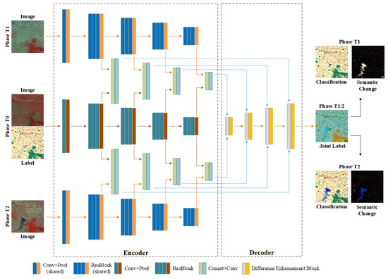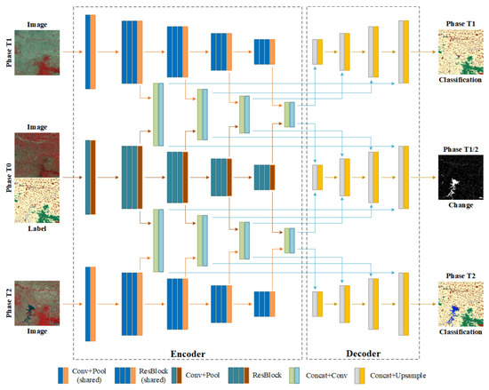 - We propose a prior semantic network architecture. Based on the two-phase data, the third-phase data and labels are introduced as prior constraint knowledge. It can solve the problem of pseudo changes caused by differences in color distribution and greatly improve the stability and robustness of change detection and semantic classification.
