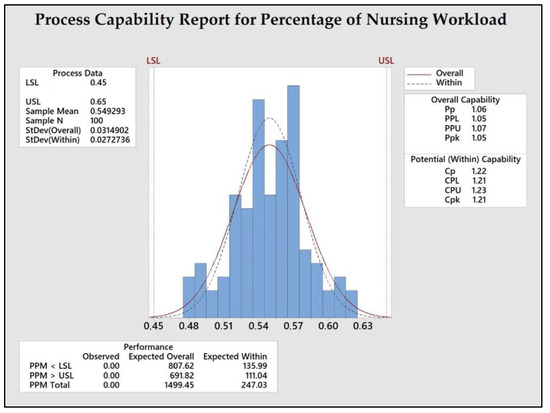 Process capability analysis of the percentage of nursing workload.