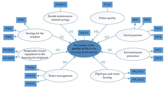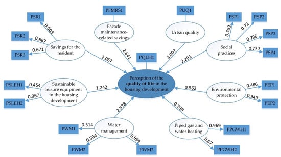 However, there are no arrows connecting the indicators and the “perception of quality if in the housing development”, “façade maintenance-related savings” and “urban quality” constructs. As there is only one indicator, it is not possible to evaluate the relationship between the indicators; thus, there is no reason to differentiate whether there is a formative or reflective relationship between them.