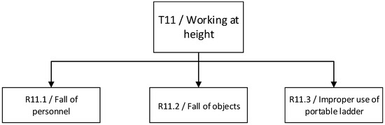 The present case study consists of a separate hierarchy for every single task, given that the AHP is applied for the risks of each project activity. For example, the hierarchy for the task “Working at height” consists of three risks (Fall of personnel, Fall of objects, Improper use of portable ladder), which will be assessed using the multicriteria method (Figure 3).