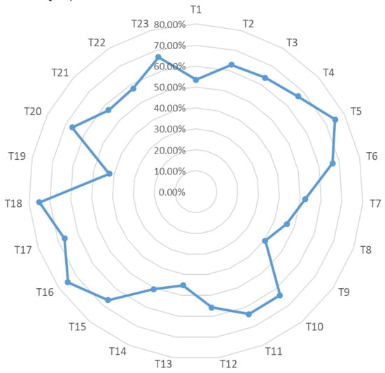 In addition, it is worth mentioning that three classes of activities are considered regarding the results. Firstly, there are some activities observed that the first ranked risk is more important than the others. In this analysis, we considered that risk is much more important than the others if it has a score of far more significance than 60% (namely, the sum of scores for the rest of the risks is by far smaller than 40%). In this class belong activities such as T2, T3, T4, T5, T6, T10, T11, T12, T15, T17, T18, T20, and T23. Next, we observed that for some tasks, there is a more critical risk (the one ranked as first), but its score is between 50% and 60%, namely, it is marginally responsible for the majority of the task’s risk. In this group, we classified activities such as T1, T7, T13, T16, T21, and T22.