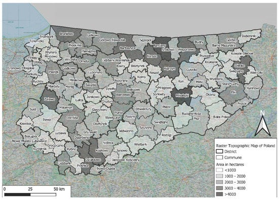 The scope of the study covers intervention activities carried out by the National Center for Agricultural Support (KOWR), consisting of KOWR exercising its pre-emptive right and the right to purchase agricultural land for the State Treasury Agricultural Property Resource (STR), henceforth referred to as declarations of intent, pursuant to the Act on Shaping the Agricultural System (henceforth referred to as the ukur Act). Figure 1 displays the area of the research (province of Warmia and Mazury) on a topographic map, including the current administrative division of the state, that is the borders of districts and municipalities, and indicating the location of the agricultural land included in the State Treasury Agricultural Property Resource (as of 31 December 2021). The analyses were based on declarations of intent (compliant with the ukur Act) in relation to each municipality, which is the smallest unit of Poland’s administrative division.