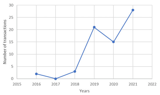 The above rights (i.e., pre-emptive right and the right to purchase) mean that in the cases specified in the ukur Act, KOWR has the right to ‘enter’ in place of the buyer and buy the property on the terms specified (including the ones agreed upon by the parties to the contract) with the payment of the price of the agricultural property in question. The National Support Center for Agriculture (KOWR) can exercise the right of pre-emptive and the right to purchase (i.e., submit a declaration of intent to purchase a given agricultural property) within a month of the receipt of a conditional sale agreement or adequate notification. It needs to be underlined that pre-emptive transactions were prevalent during the analyzed time period and in the area selected for the research, i.e., the province of Warmia and Mazury. In 2020, for example, only one notarial deed resulting from a declaration of the intent to make a purchase and concerning an agricultural property of an area of 3.9524 ha was performed. In total, from May 2016 until the end of October 2021, the Olsztyn Branch Office of KOWR purchased 66 real estate properties by exercising the pre-emptive right and right to purchase, including two transactions in 2016, three transactions in 2018, 21 transactions in 2019, 15 transactions in 2020, and 25 transactions in 2021. This is illustrated in Figure 2.