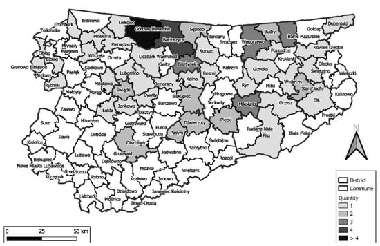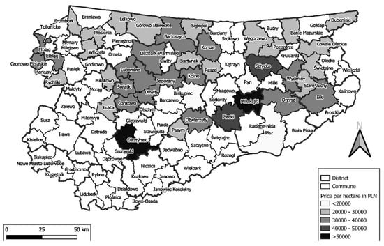 Considering the spatial distribution, most transactions during the analyzed time were concluded in the northern part of the province, especially in the municipality Górowo Iławeckie (Figure 3).