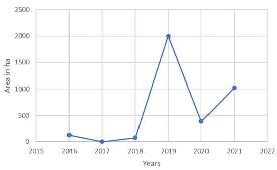 Regarding the amount of land bought following the submission of a declaration of intent, pursuant to the ukur Act, most land was purchased for the State Treasury Agricultural Property Reserve in 2019, when it totaled 2000 ha of farmland (Figure 4).