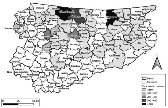 Most areas of agricultural land were bought for the Reserve in the municipalities of Górowo Iławeckie, Węgorzewo, and Bartoszyce, which is in the northern part of the region which, as mentioned earlier, also stood out in terms of the number of transactions (Figure 5).
