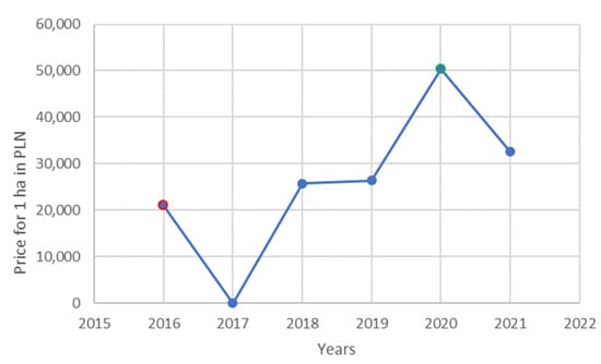 The lowest average transaction prices for 1 ha of land were achieved in 2020, when they approximated 50,000 PLN/ha, i.e., around 11,000 EUR/ha. This is shown in Figure 6.