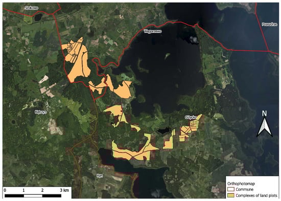 Another interesting transaction, also performed in 2019, involved a total land area of 700 ha. The plots are located in two adjacent municipalities: Węgorzewo and Giżycko (Figure 10), and the average price per 1 ha was around PLN 25,000, that is EUR 5600. These land parcels are characterized by attractive location but are dominated by a typically agricultural function.