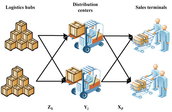 The research object of this article is an urban logistics enterprise, which is responsible for collecting materials from large logistics hubs normally located on the periphery of cities, selecting and assembling the goods through several alternative distribution centers, and then distributing them to the sales terminals located in all corners of the city. The business process is shown in Figure 1. In the logistics network, the location of the logistics hubs and the maximum quantity of goods supplied are known, the location and maximum distribution capacity of all alternative distribution centers are also known, and the demand of the sales terminal is independent and determined. Taking into account the government’s new carbon tax regulations, the city’s logistics enterprise needs to replan its distribution network, to minimize the total operating cost, including the cost of logistics itself and carbon emissions.