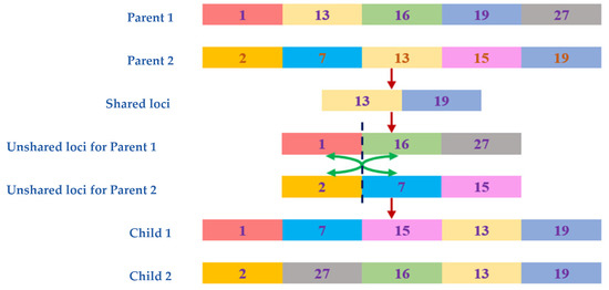 The so-called shared loci refer to loci composed of the sequence numbers shared by the two parent individuals, and then a random single-point crossover operation is performed on the two unshared loci after removing the shared loci from the two parents to generate a new individual. It is guaranteed that the same sequence numbers will not appear at the same time in the children. The process is shown in Figure 2 below.